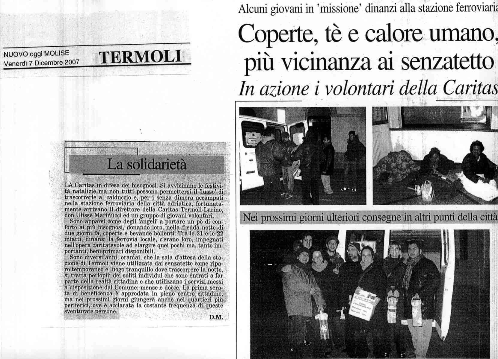 Alcuni si concentrano in maniera particolare presso le sale d’aspetto della Stazione, ma non è un caso vederli anche in altre zone della Città. Spesso sono persone che già utilizzano i servizi Caritas come la Mensa, le Docce, il Guardaroba e l’ambulatorio messi a disposizione presso la Cittadella della Carità. La Caritas in questo momento non dispone di strutture che permettano la possibilità di una accoglienza al coperto e, quindi abbiamo pensato di essere vicini a loro attraverso gli strumenti che al momento possediamo. Pertanto, nel mese di Dicembre 2007 è stata attivata una piccola squadra di volontari – sotto la “direzione” della Caritas Diocesana - composta da diverse realtà ecclesiali come la Pastorale Giovanile, gli Scouts, l’Azione Cattolica, Comunione e Liberazione... che nelle notti di particolare freddo sono stati presenti nei luoghi dove si riparano queste persone per portare loro non solo dei generi di conforto come possono essere un the caldo o una coperta, ma anche – come ci insegna il Vangelo – la vicinanza e il rispetto per l’uomo e per la sua dignità.
